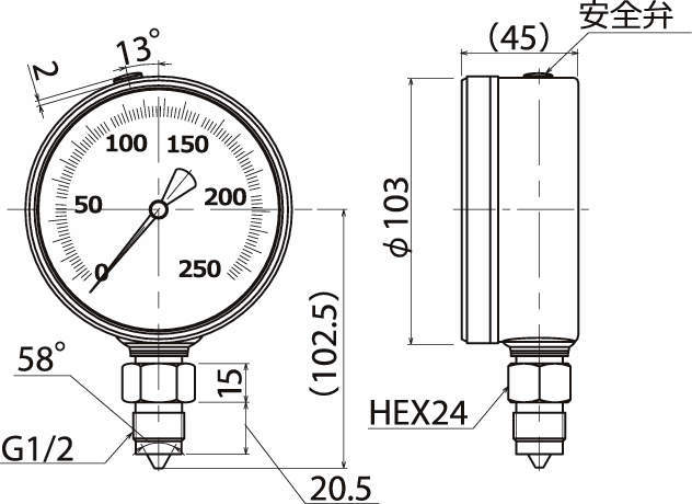 *高使用圧力 200MPa *高目盛 250MPa ねじ口径 G1/2自在ねじ
